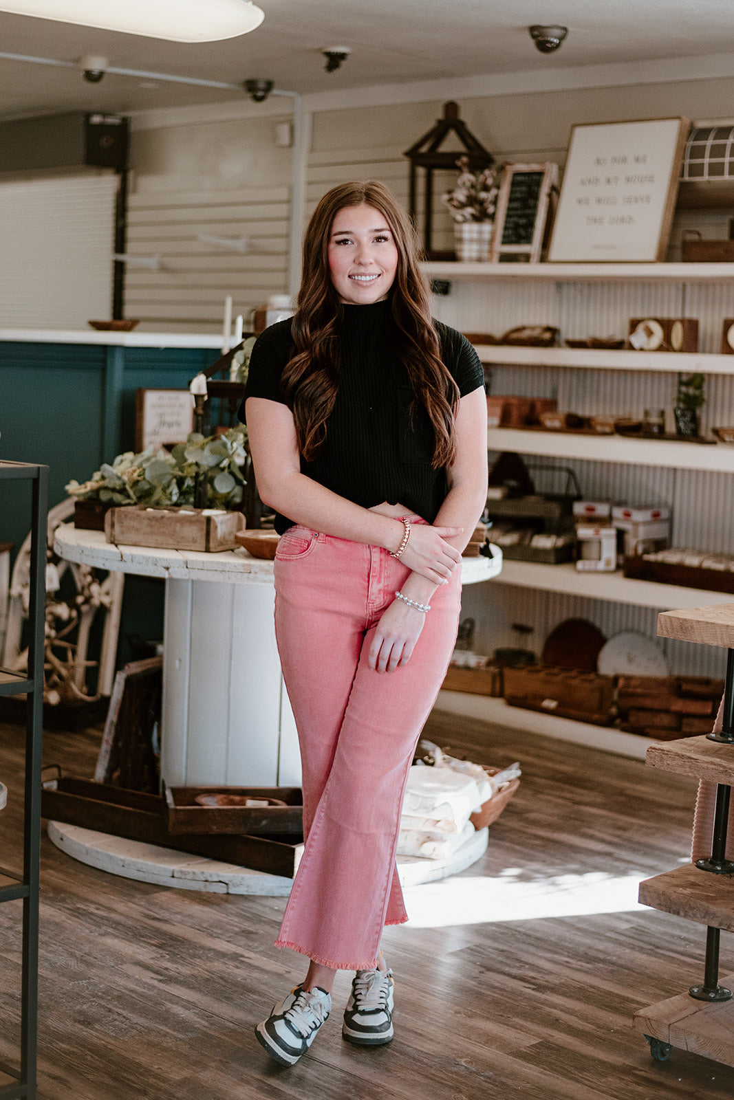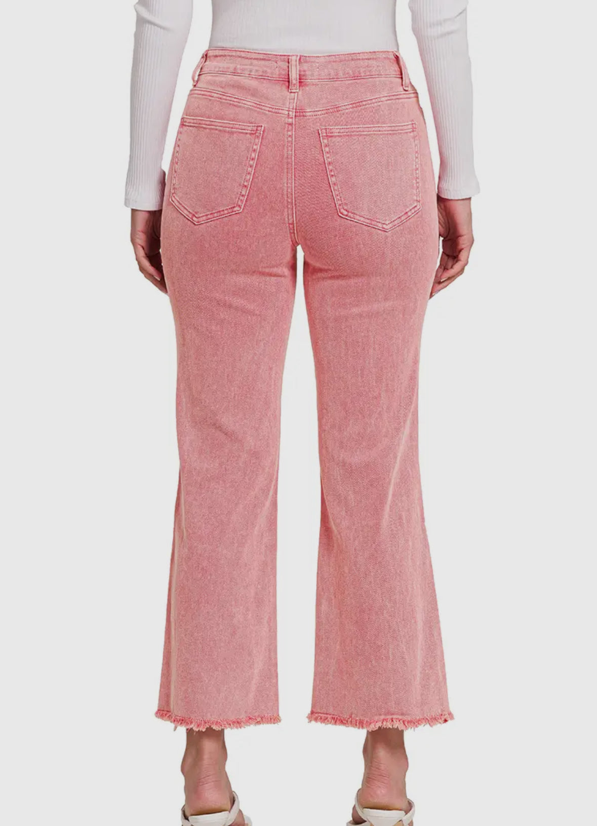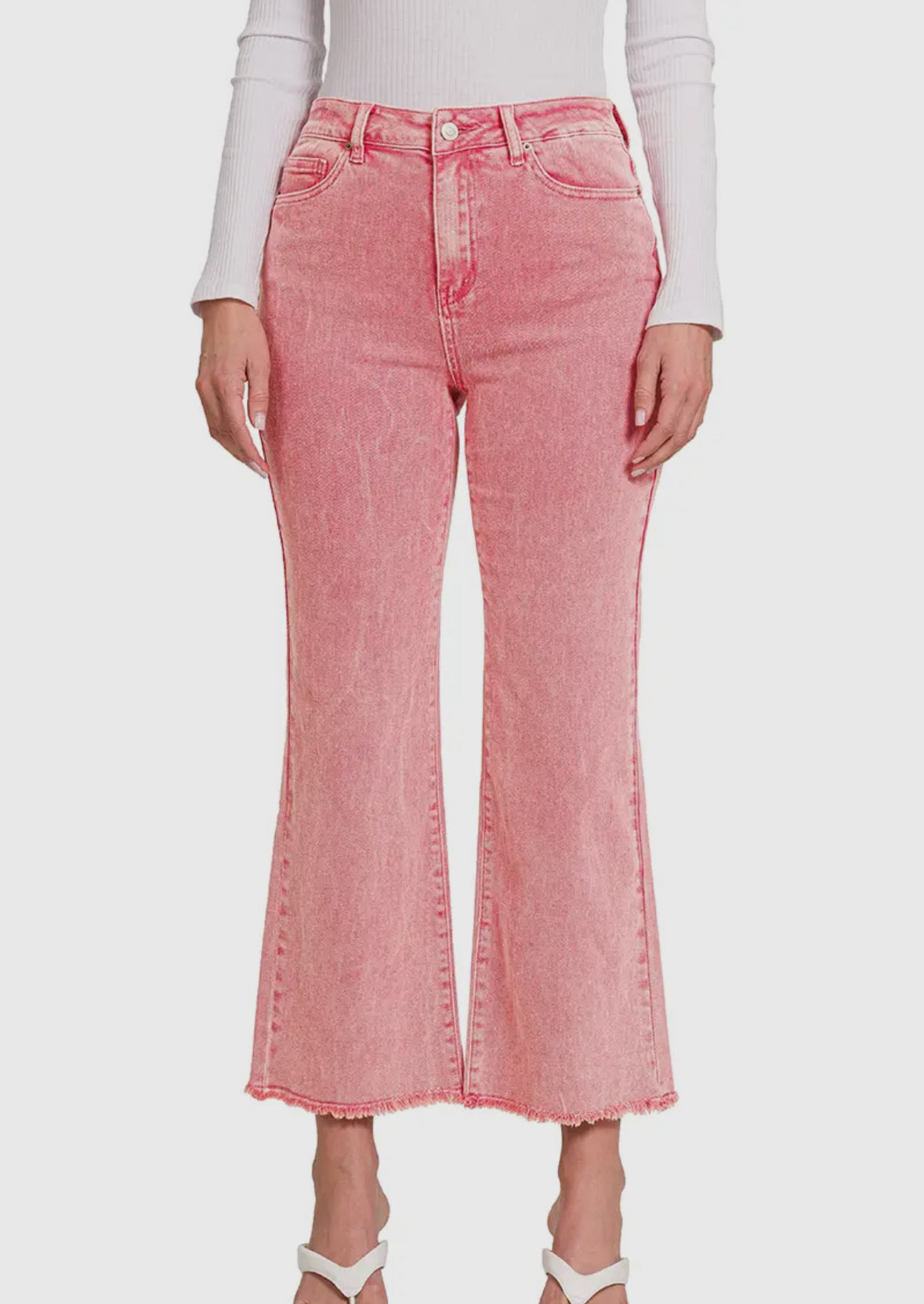 Acid washed ash pink, high waist, bootcut with a frayed hem.