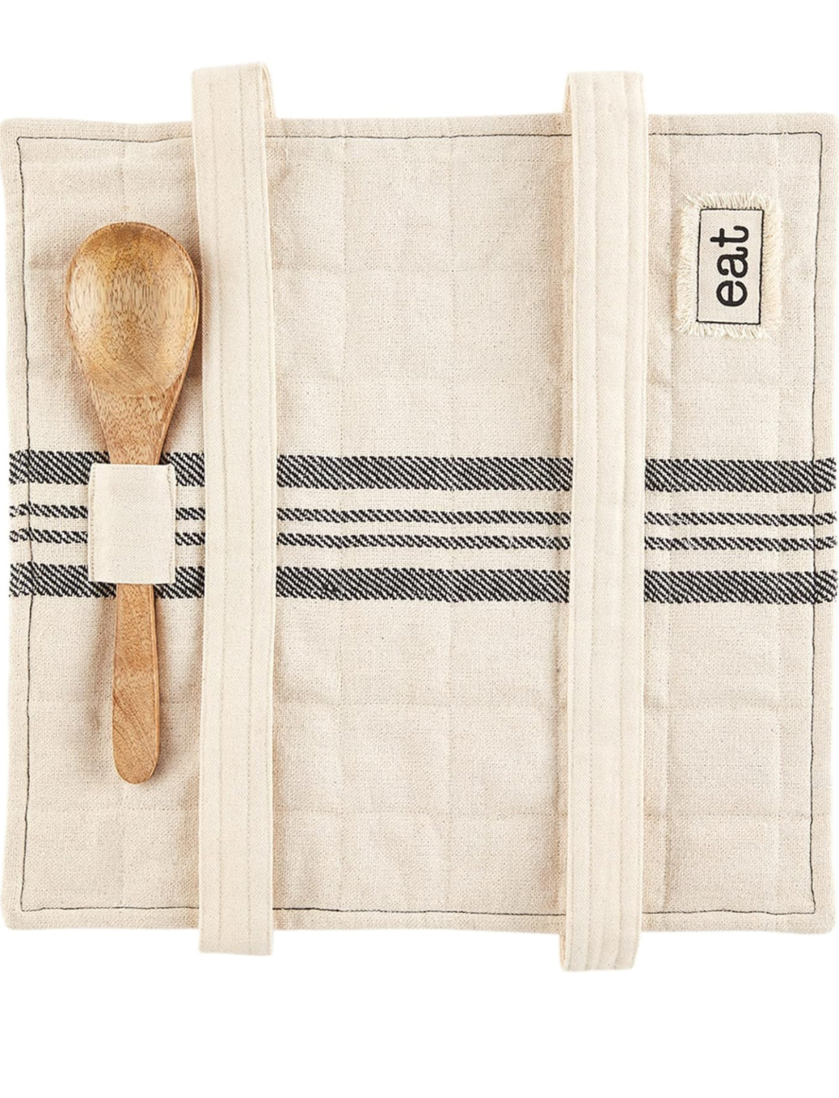 - Quilted canvas casserole dish holder holds included wood spoon with loop tab. Zipper closure.