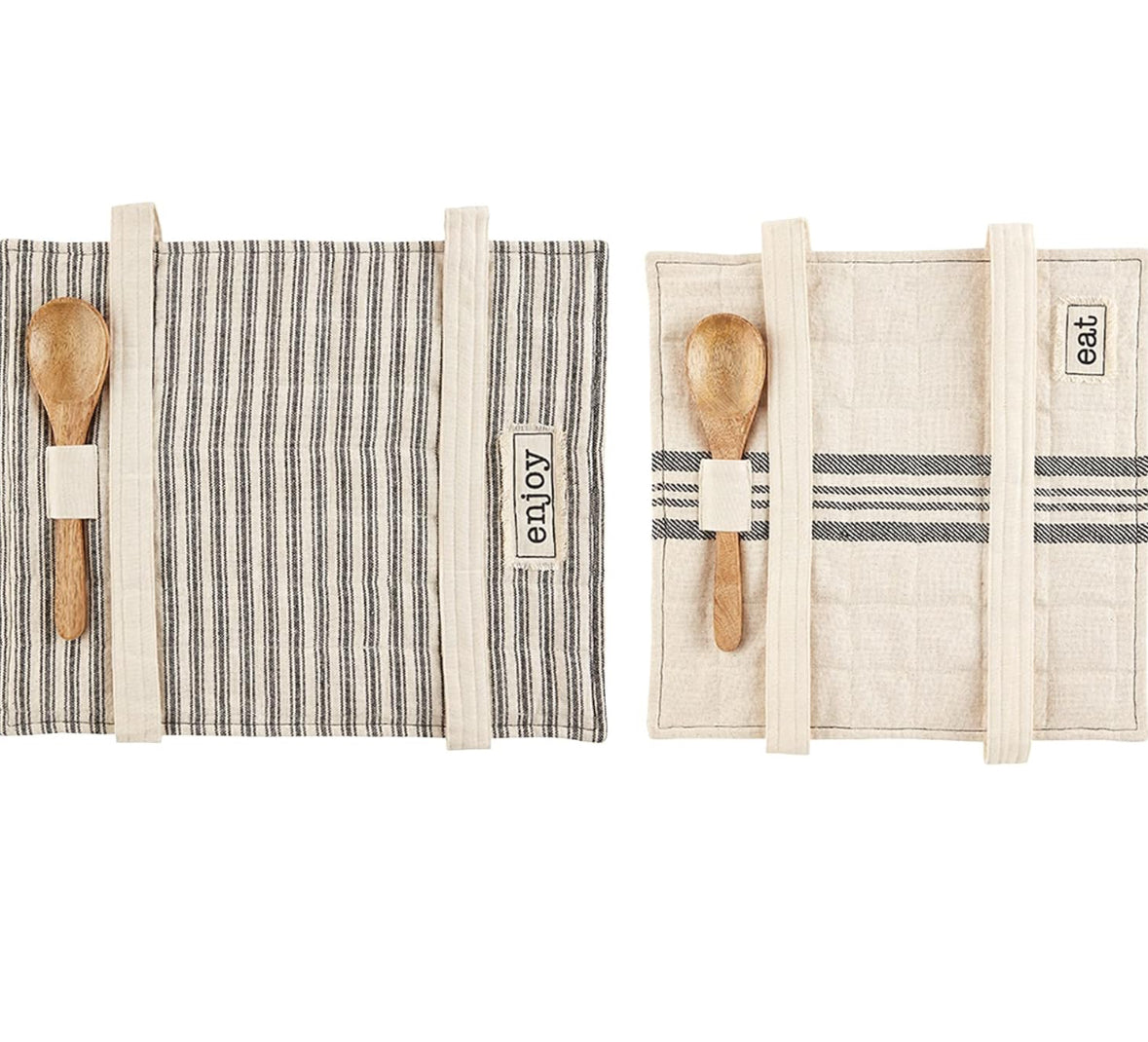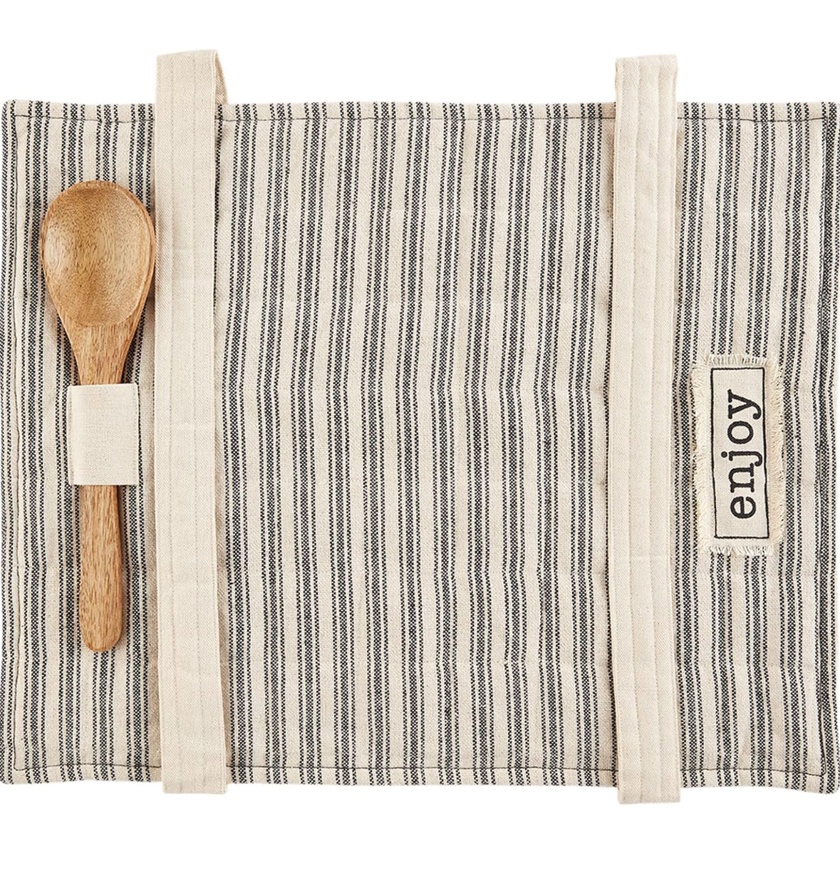 Take a meal to a friend with our Enjoy Casserole Holder. The set comes with a quilted canvas casserole dish holder. The holder holds an included wood spoon with loop tab. The holder has a zipper closure. Slide casserole dish inside holder tor retain heat and protect ceramic.