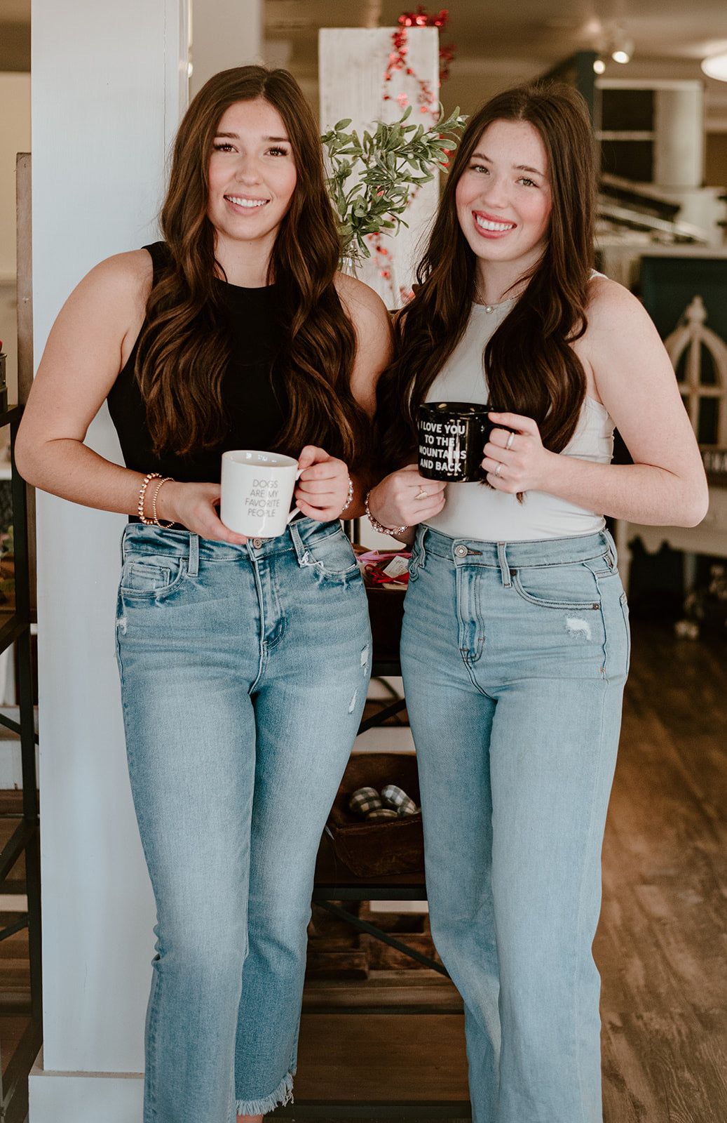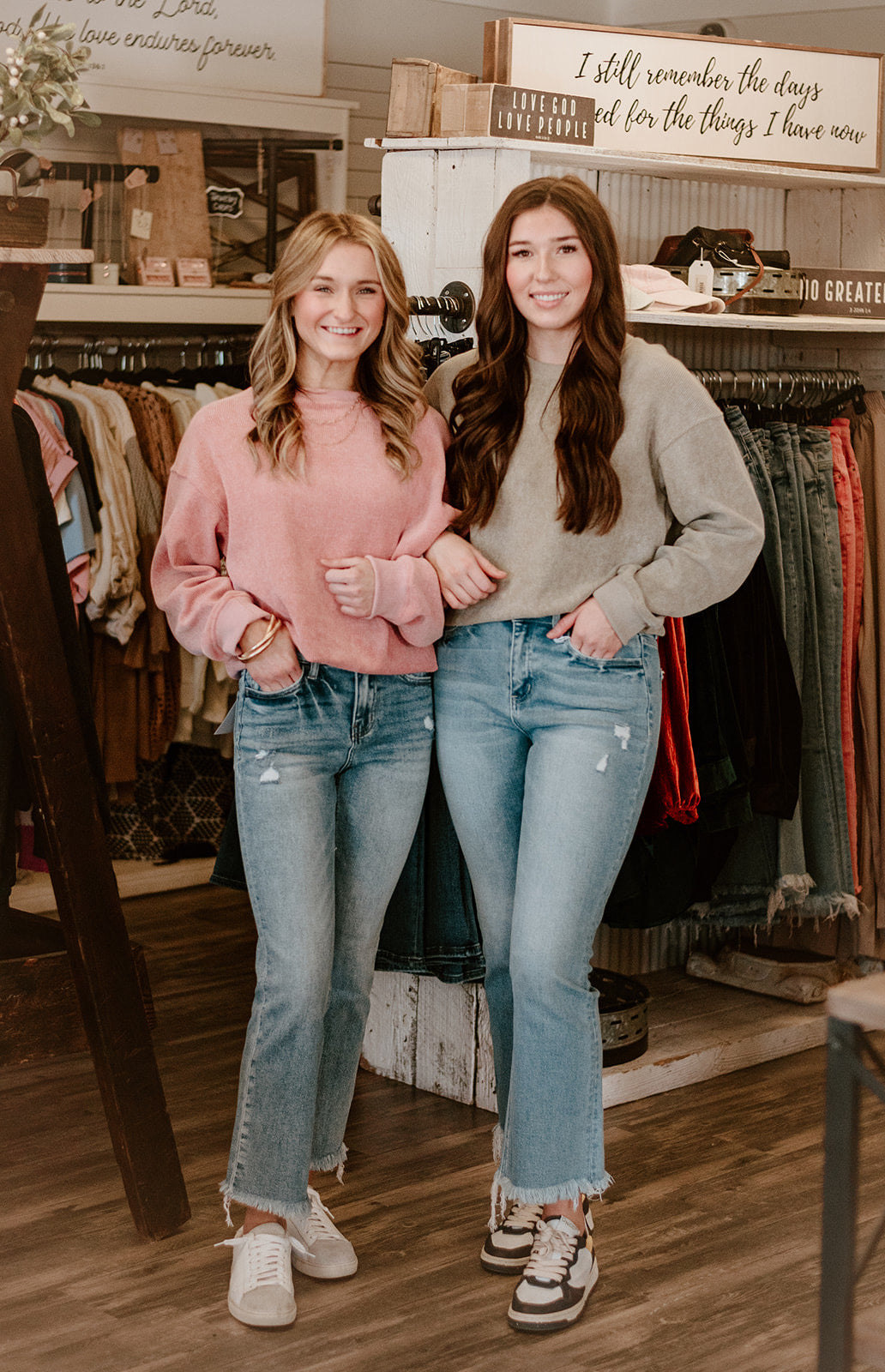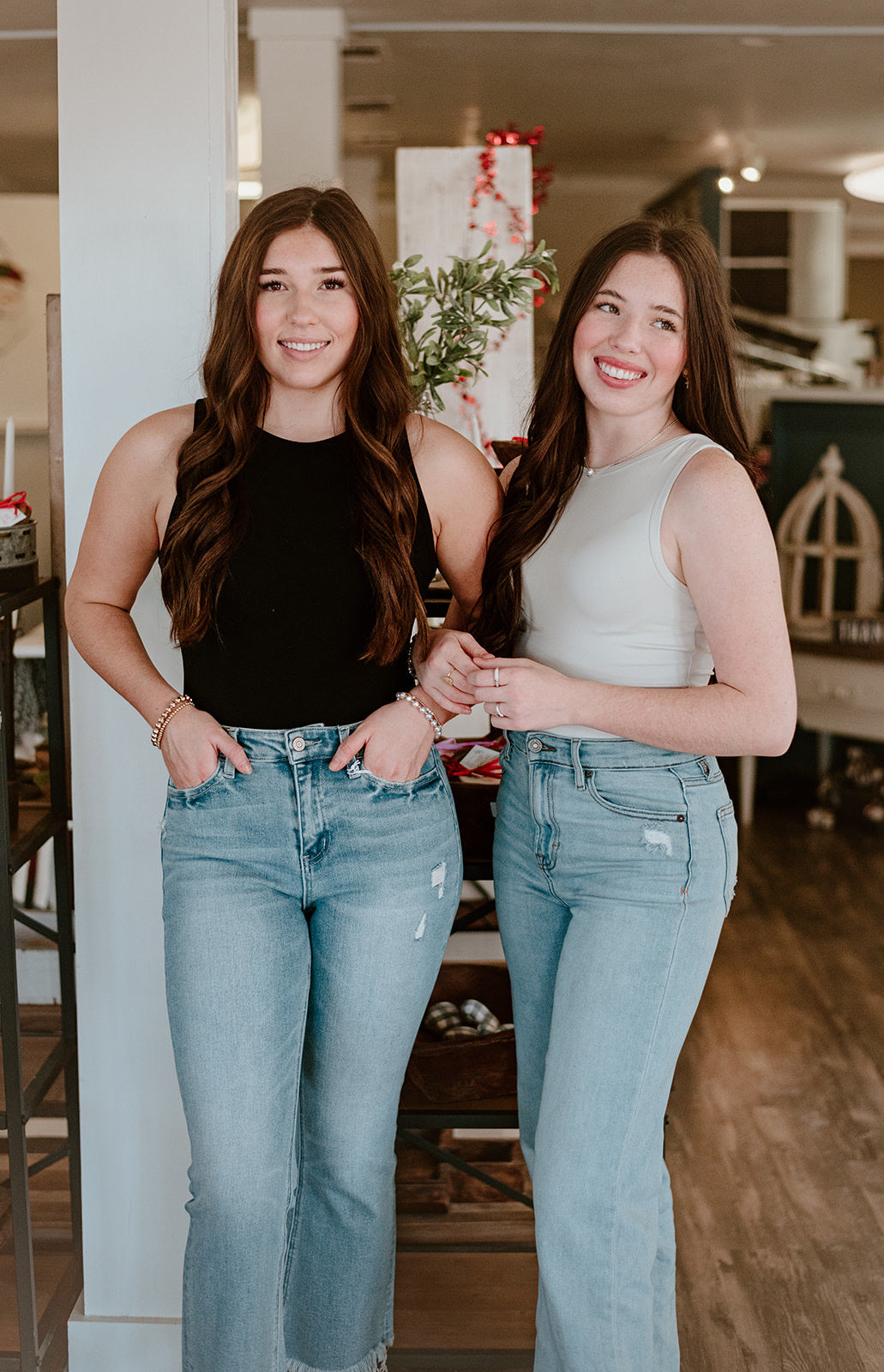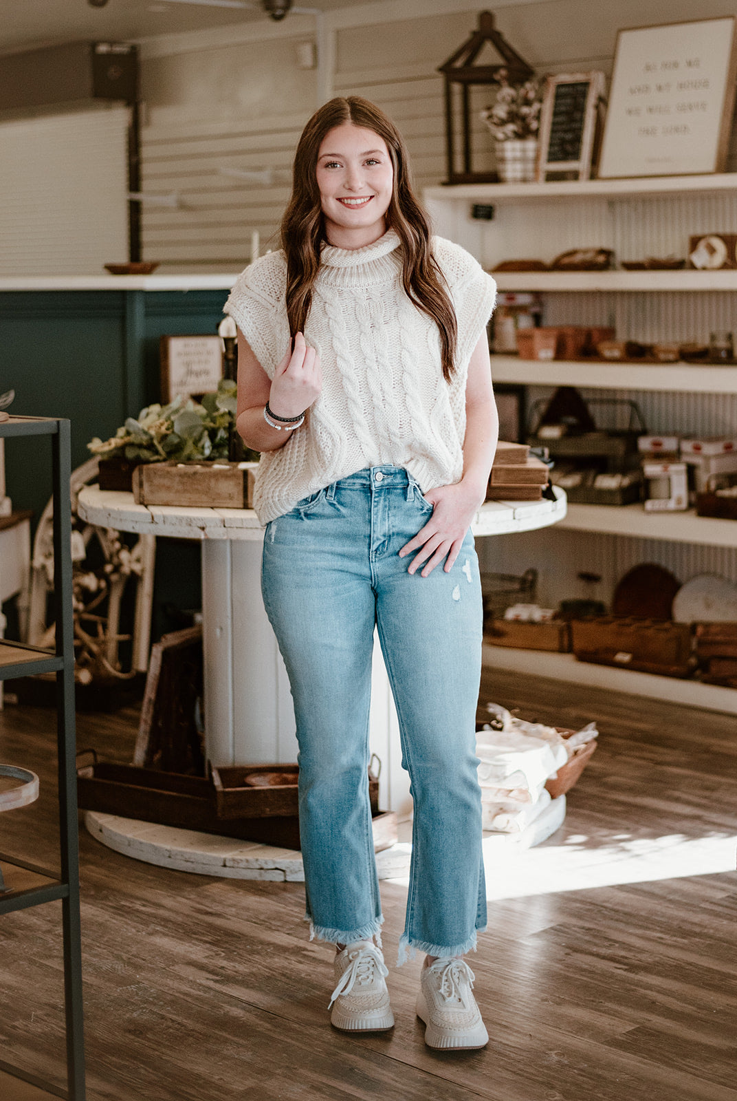 Flying Monkey brand comfort stretch denim with distressed detail. A high rise waisted, kick flare jean with a cropped length and raw hem.